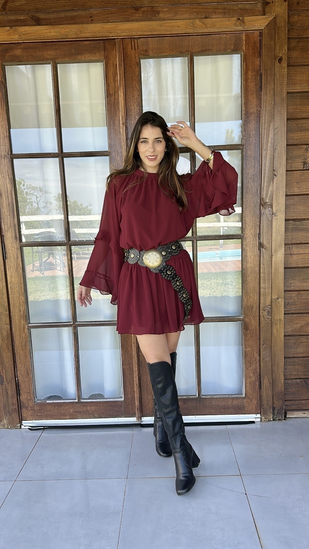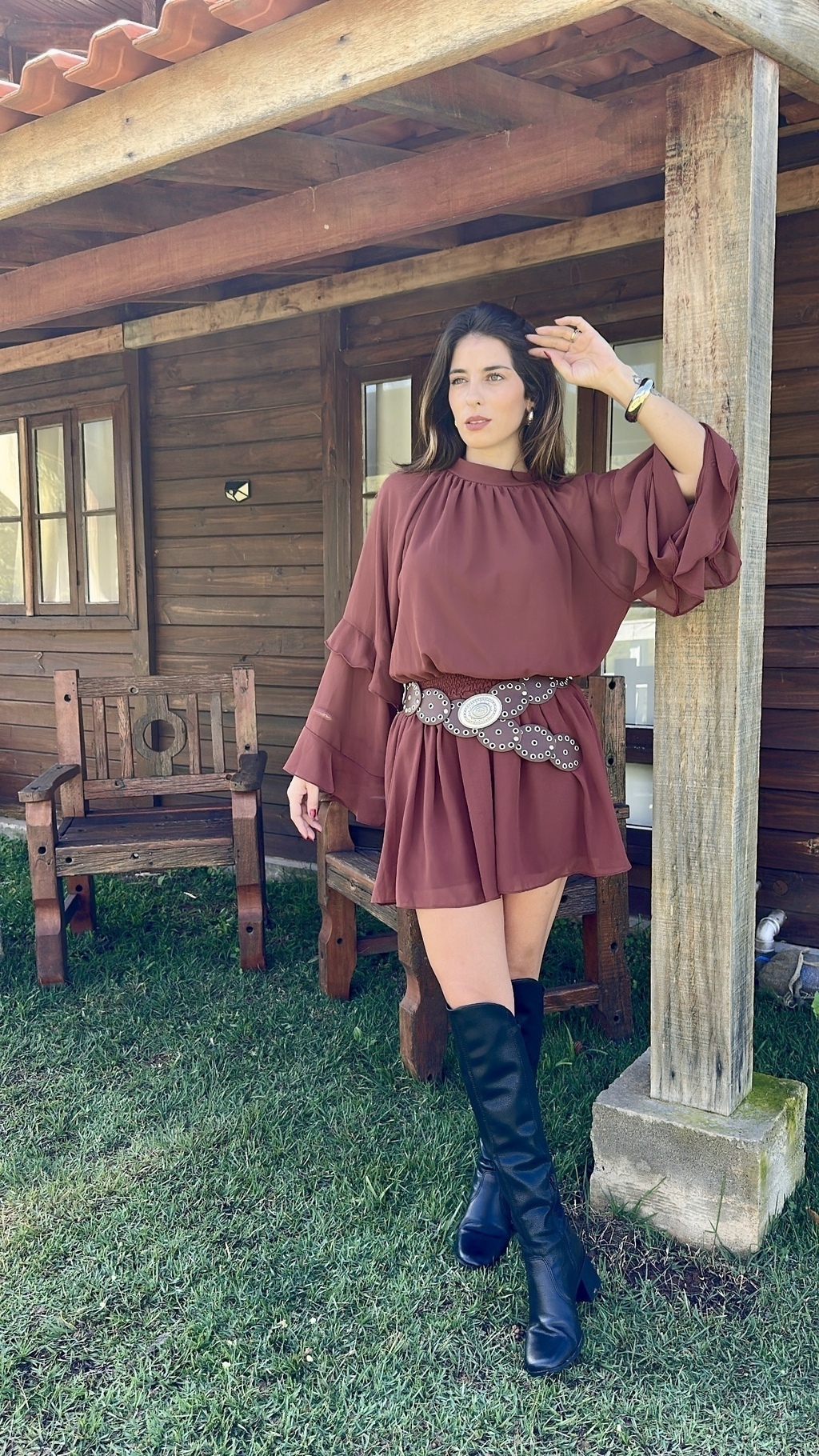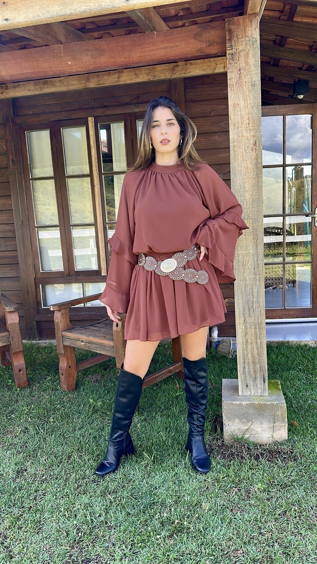 Macaquinho curto, manga longa morcego com babado, elástico na cintura que permite melhor ajuste no corpo e detalhe em amarração atrás. Tecido não amassa, leve e confortavél.