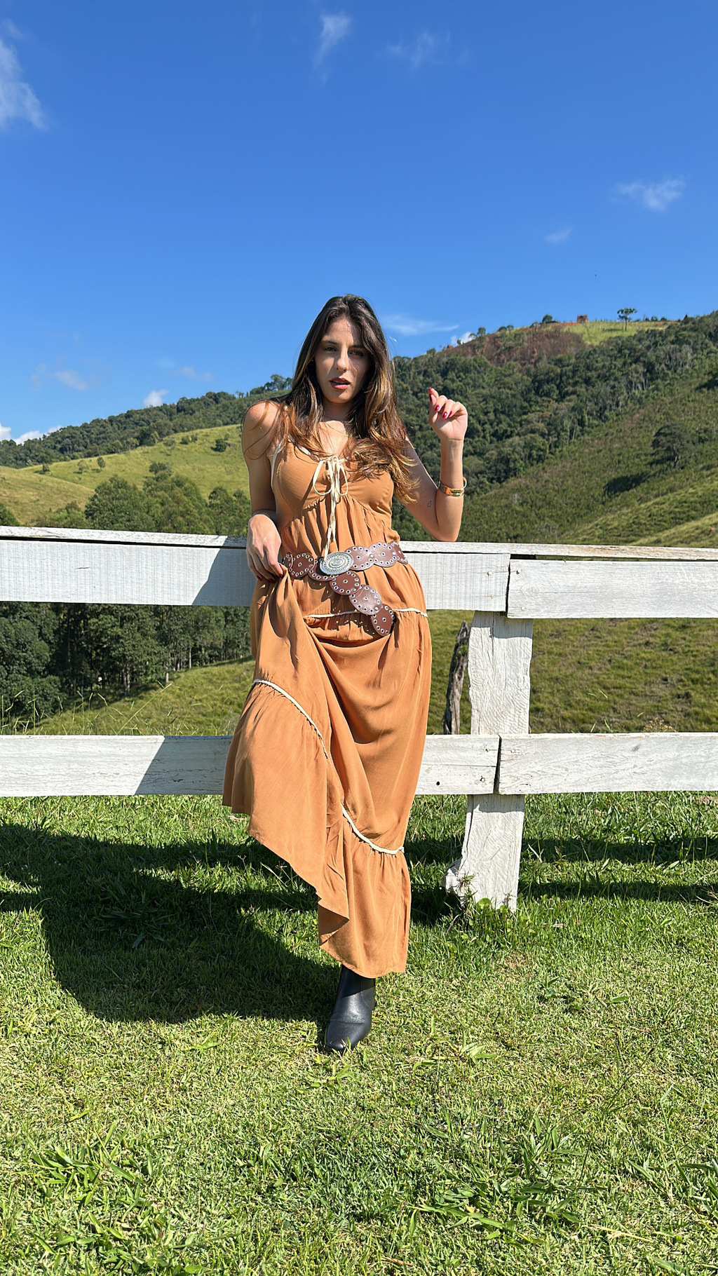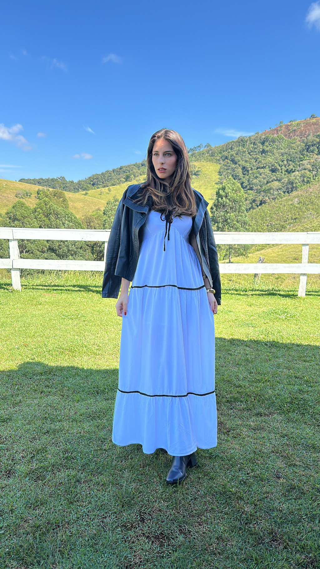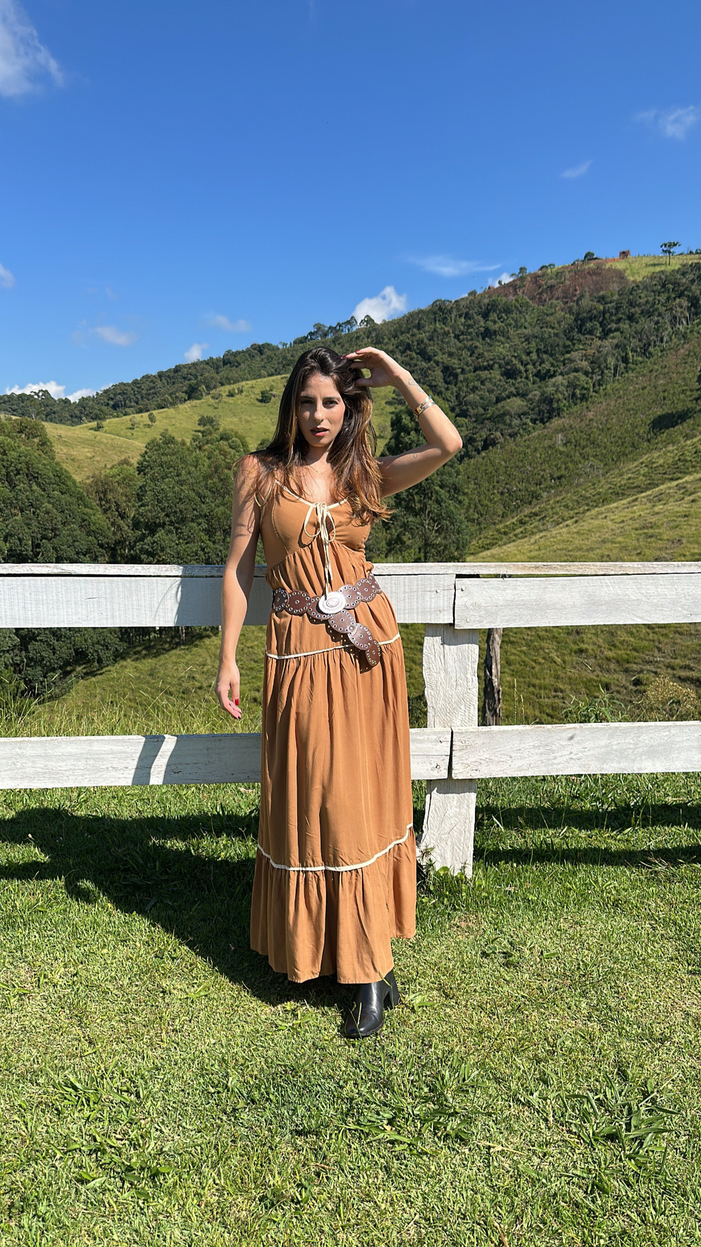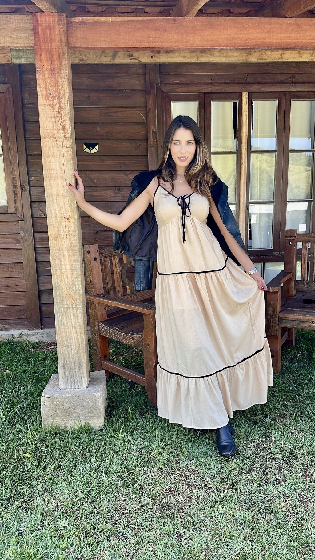 Vestido longo, alça regulável, possui elástico na parte de trás, saia em camadas, possui bojo e forro.